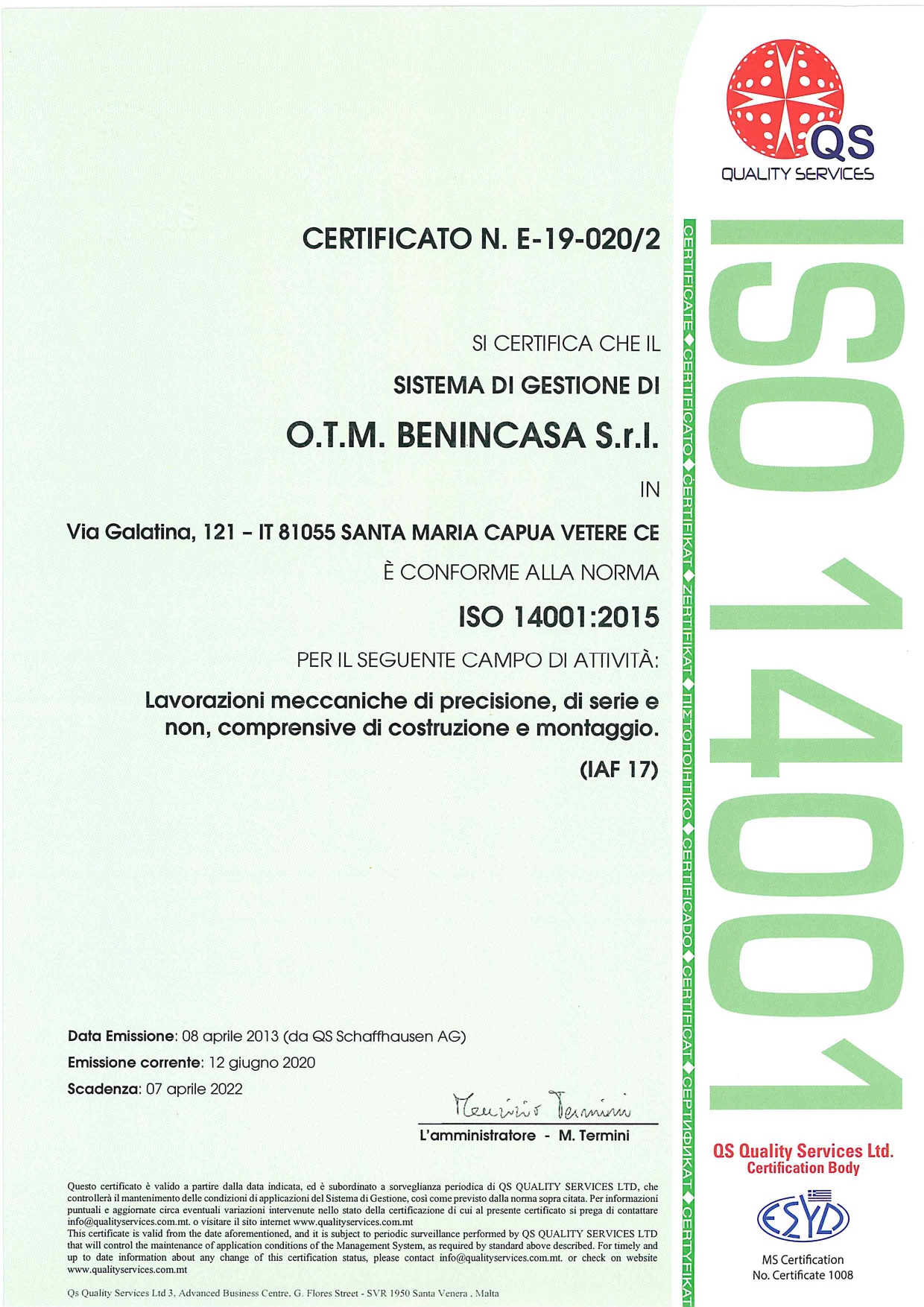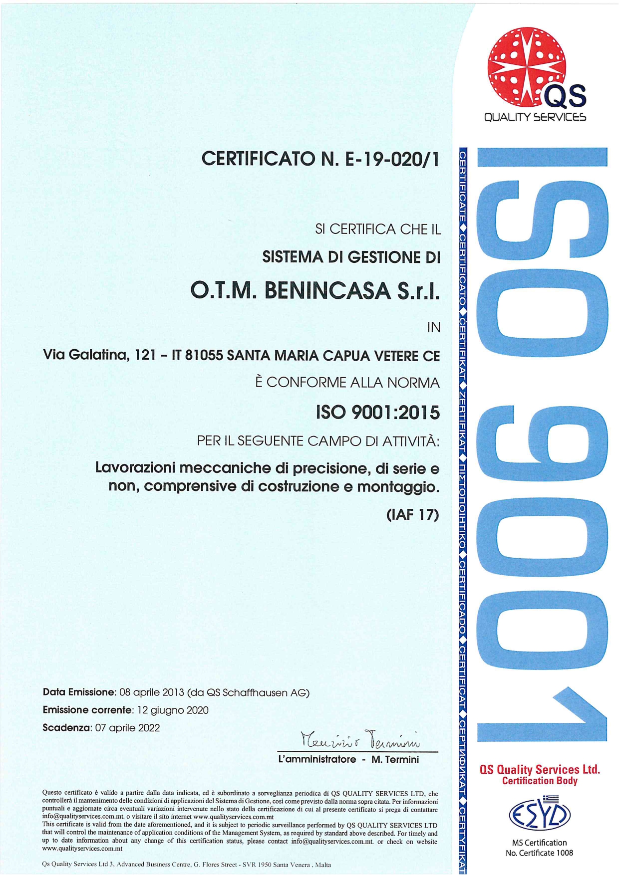 LE PROCEDURE USATE PER LA LAVORAZIONE E LA GESTIONE D’IMPRESA SONO QUELLE STABILITE DALLE NORME UNI EN ISO 9000 PER LE QUALI ABBIAMO OTTENUTO LA CERTIFICAZIONE ISO 9001 E ISO 14001.